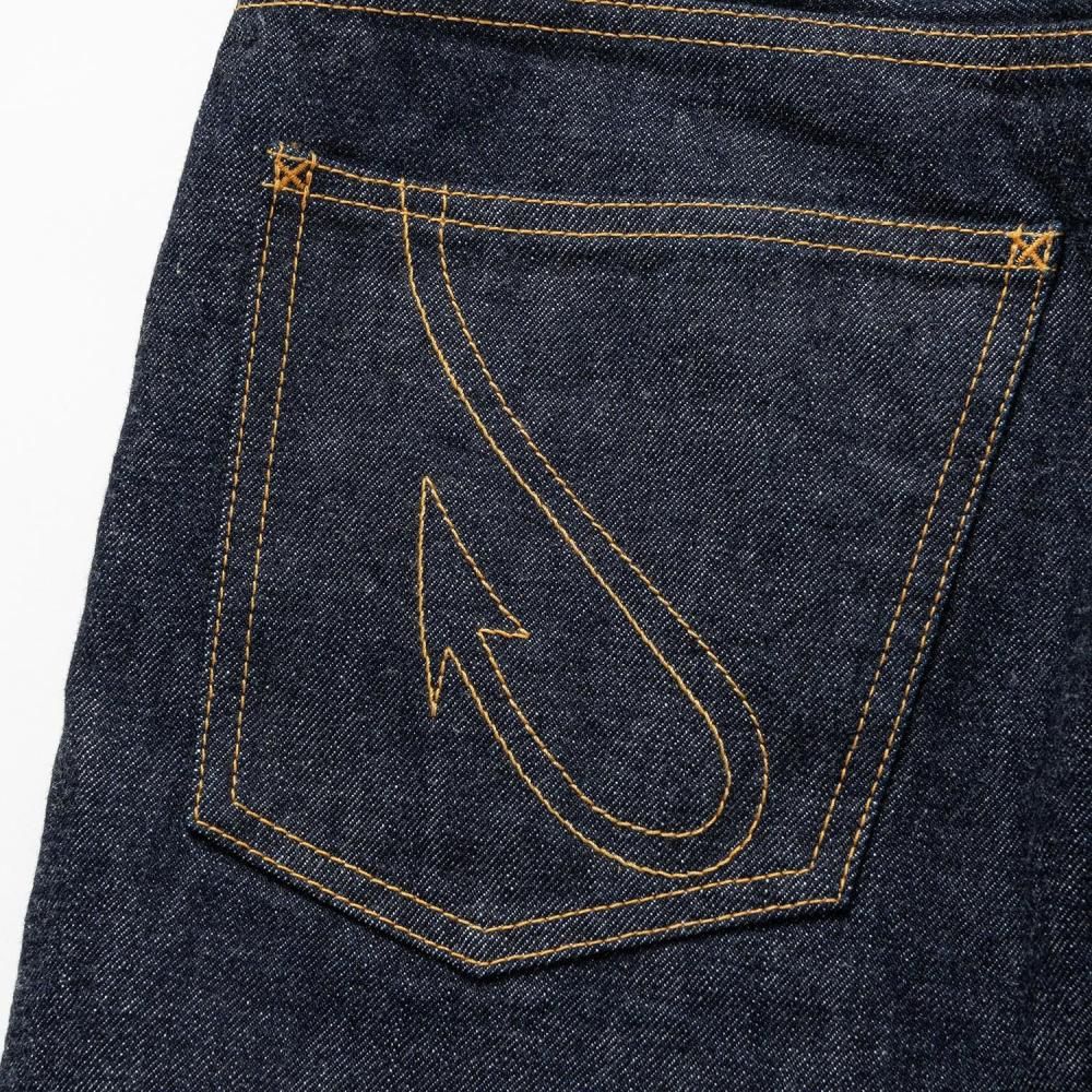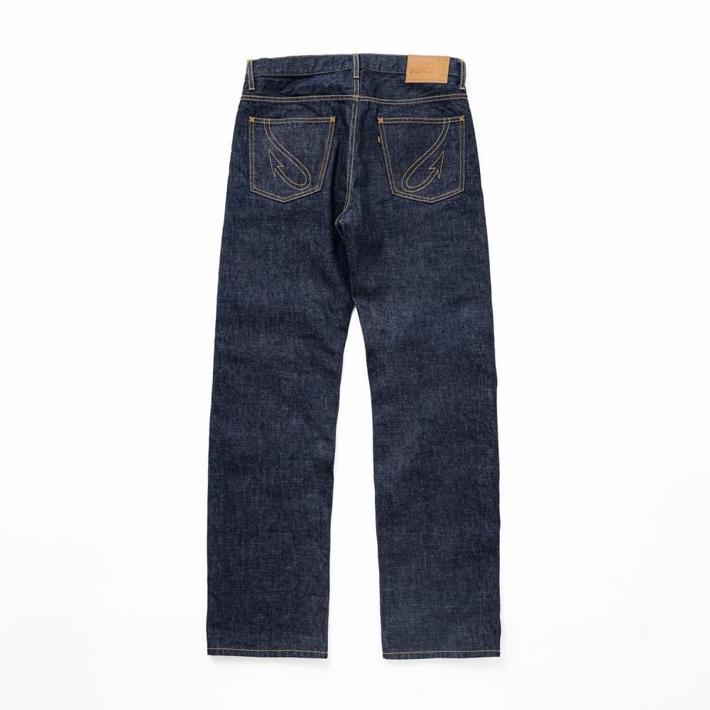 13.5oz.のセルヴィッチデニム生地を使用した5ポケットデニムパンツ。全ての縫製糸を橙色で統一させたデザイン。両腰にL字型ポケット、フロント右にコインポケット、背面左右にパッチポケットを配置。右腰にBLACK AND YELLOWの刻印が入るレザーパッチを叩きつけ。ヒップポケットにはRATSデニムのアイコン、Ratテールのステッチが施された仕様。背面右ポケット左脇にピスネームを挟み込み。ウエスト・腿にゆとりのある、ストレートシルエット。製品でワンウォッシュ済み。1色5サイズ展開。