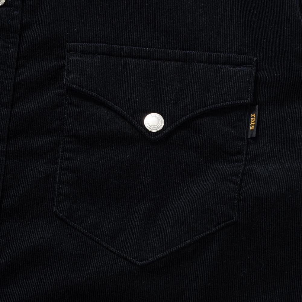 滑らかで上質な表情の21ウェルのオーガニックコットンコーデュロイ生地を使用したウエスタンシャツ。胸元左右にフラップポケットを配置、左ポケット脇にピスネームを挟み込み。前立て・袖口に使用したボタンはRATS刻印入りスナップボタンを採用。袖は2個ボタン・剣ボロ仕立て、裾は緩やかなラウンドカット。レギュラーフィットシルエット。製品にてワンウォッシュ加工。1色5サイズ展開。