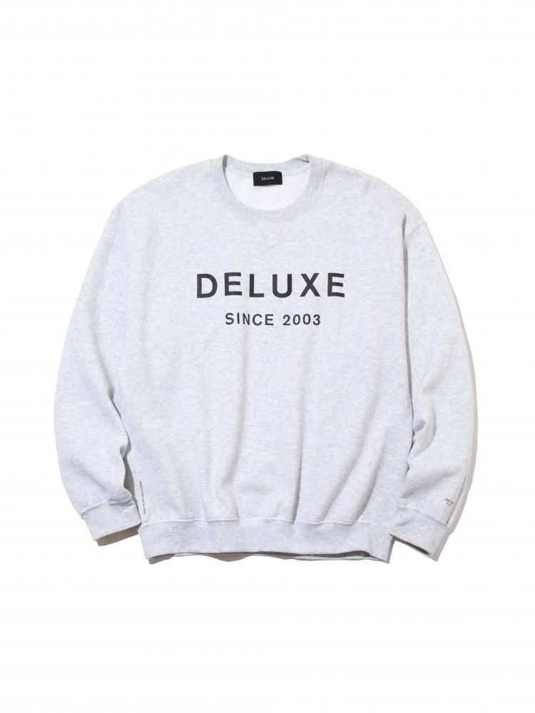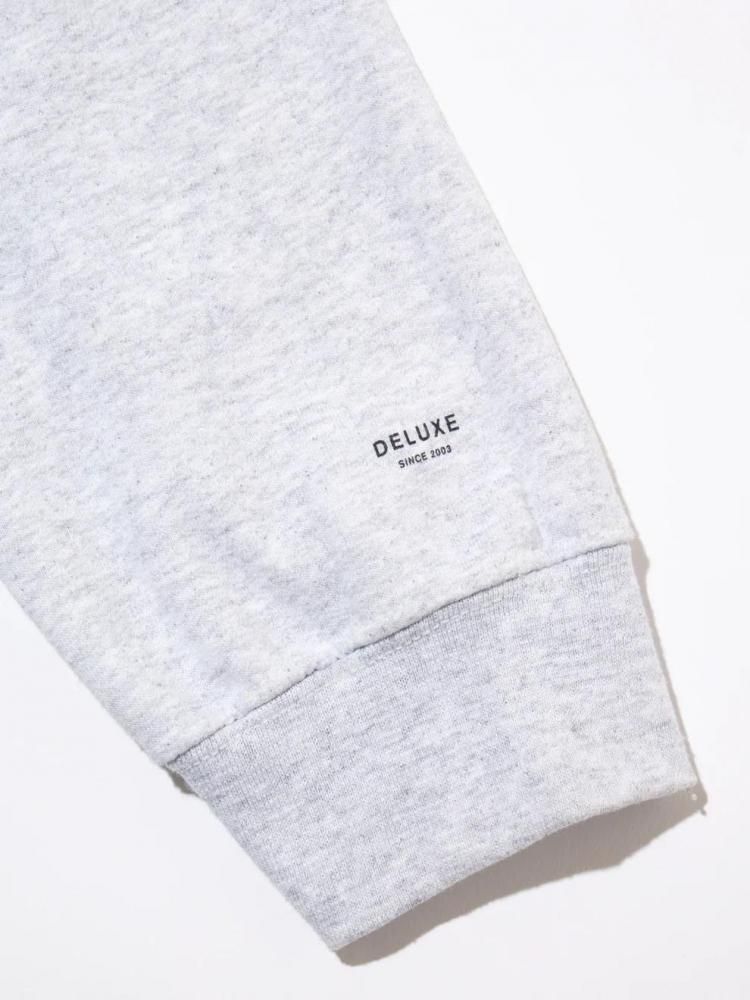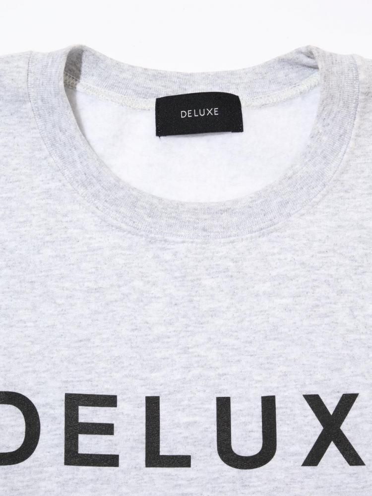 ハリ・コシに優れるオリジナルで作成したコットン裏毛素材のクルーネックスウェットシャツ。胸元にブランドロゴ、左袖に DELUXE since 2003、右脇下にコピーライトレターをラバープリント。身幅にややゆとりのあるシルエット。2 色 3 サイズ展開。