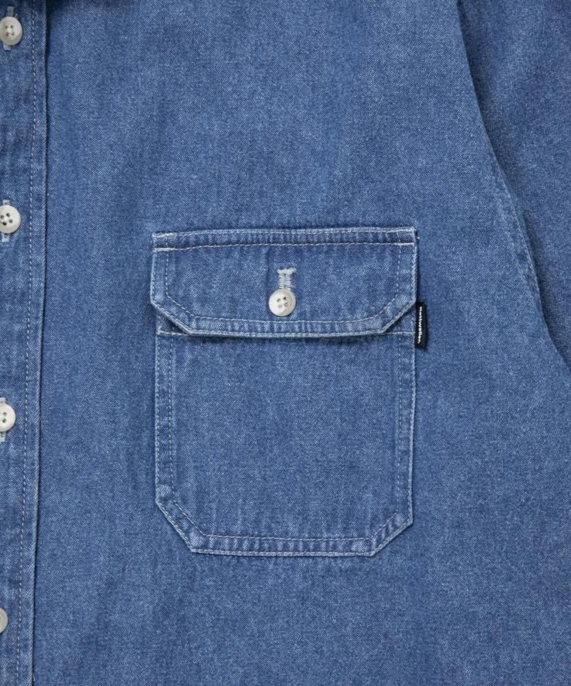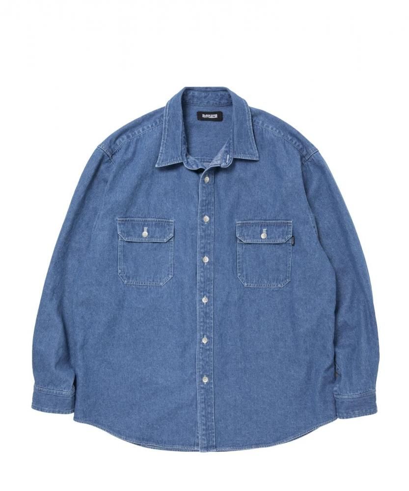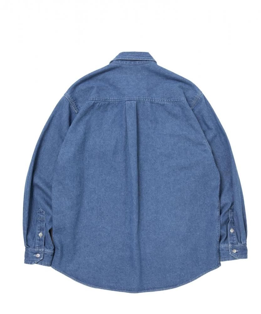 8.5oz のデニム生地を使用したワイドシルエットのレギュラー カラーシャツです。ストーンバイオ加工を施しています。