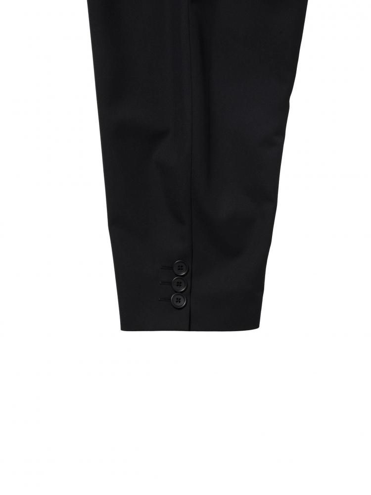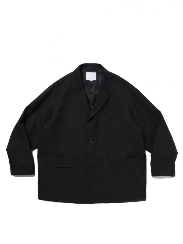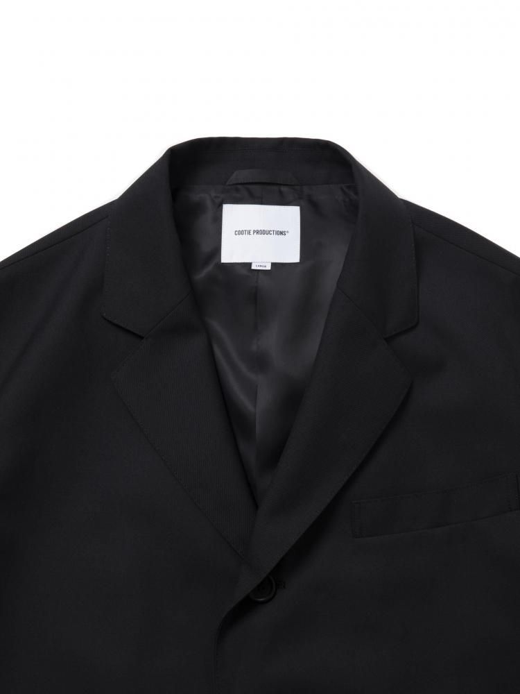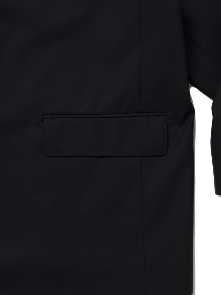 ウール、ポリエステルの混紡糸の高密T/Wサキソニーを使用。クリアな光沢と程よいドレープ性を持つ。表地撥水加工。裏地に肌当たりのいいキュプラツイルを使用。ワイドシルエット。