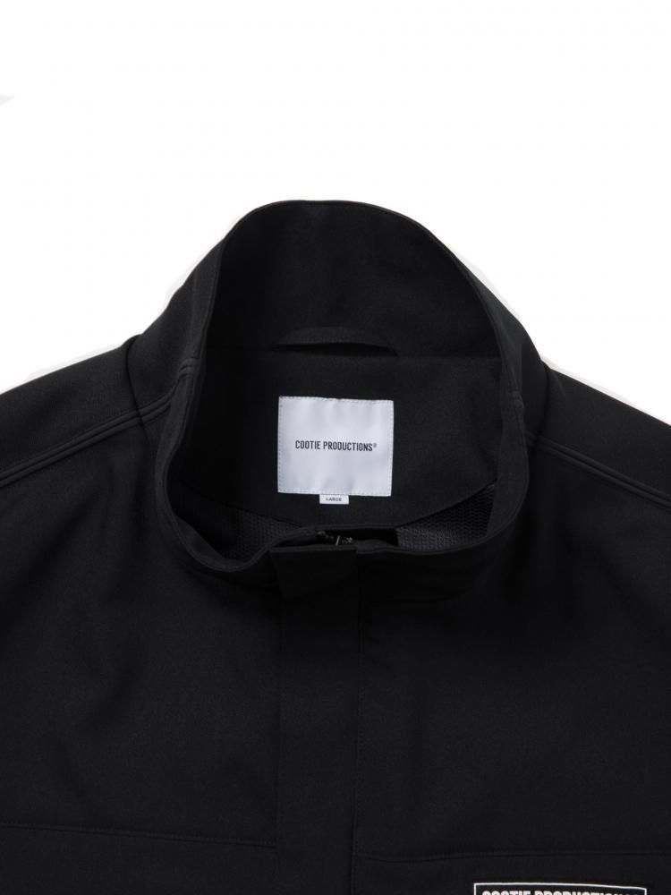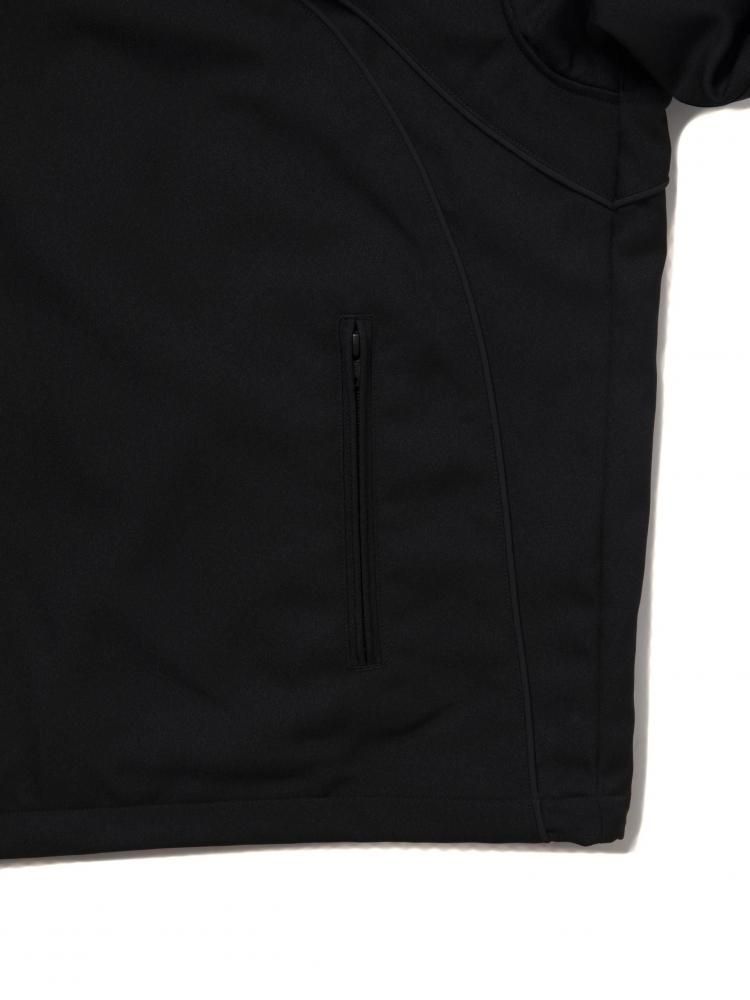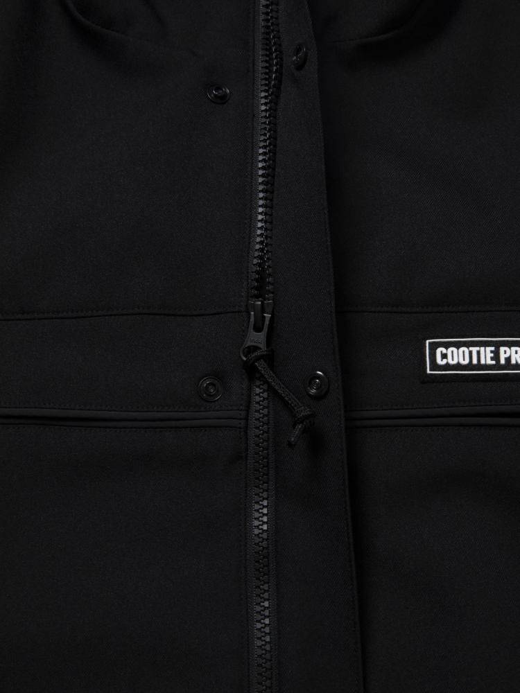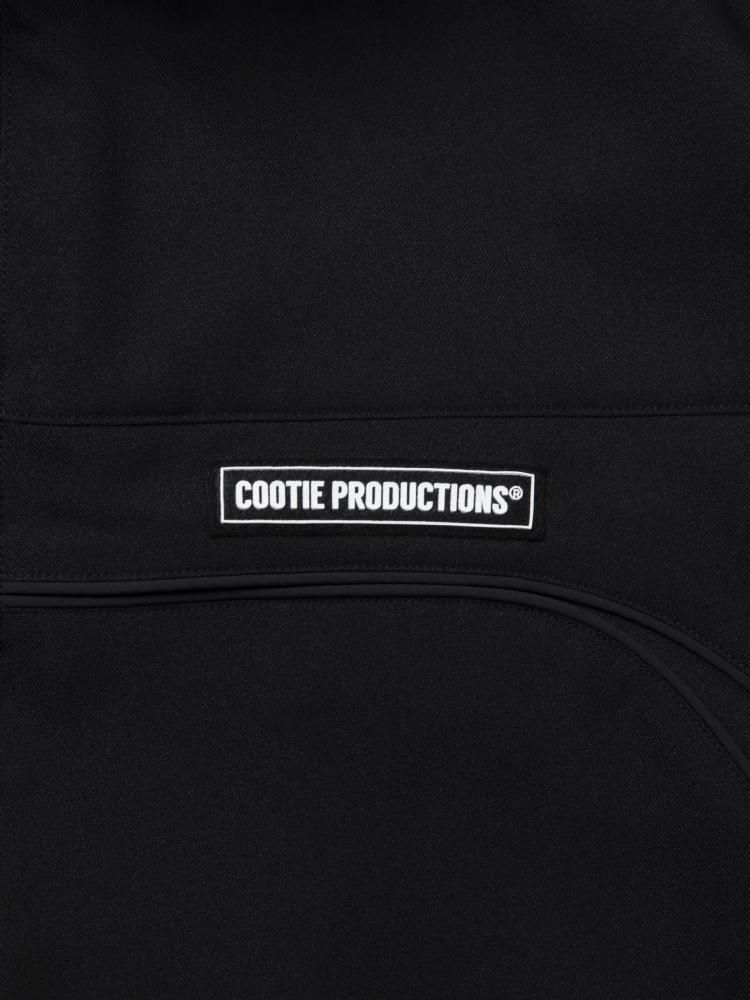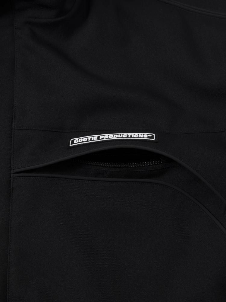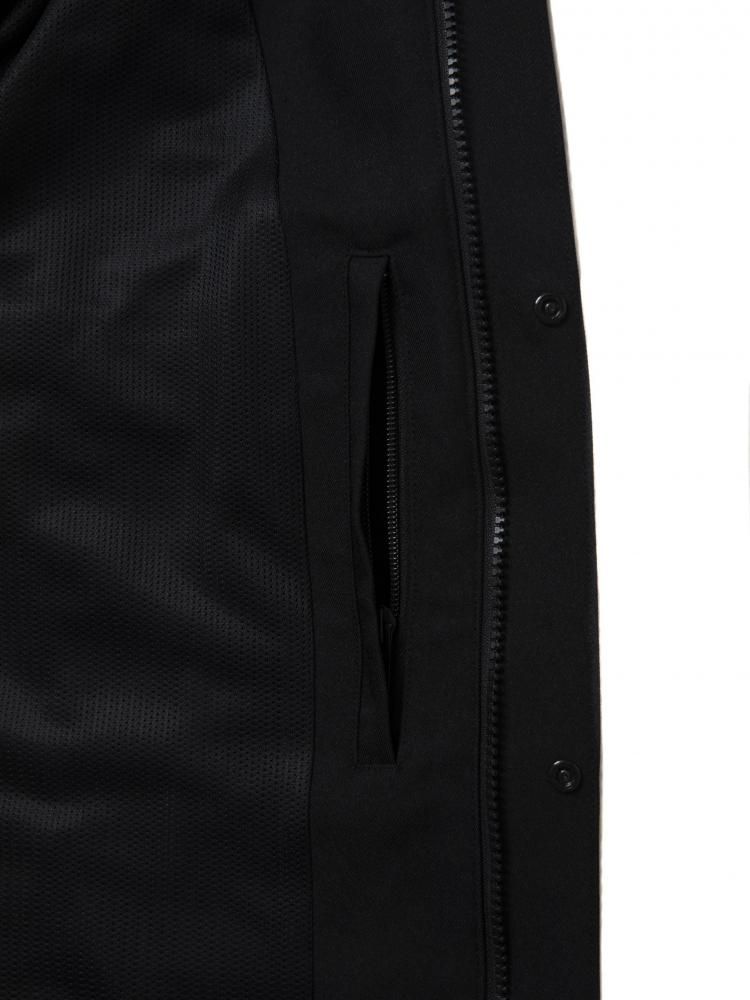 制電糸を入れることにより帯電防止に優れたストレッチポリエステルツイル地を使用。総裏メッシュ仕様。裾にドローコードが付く。ワイドシルエット。