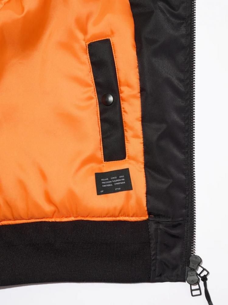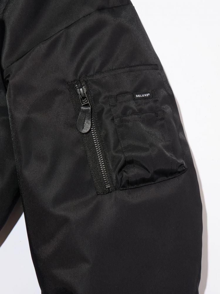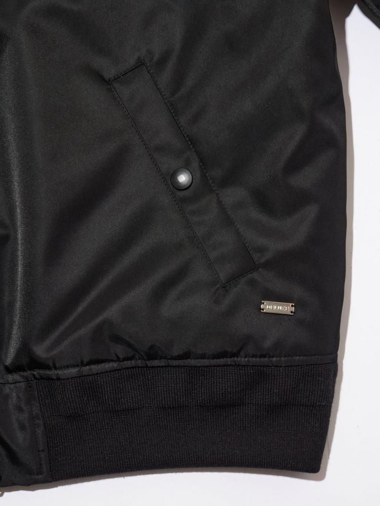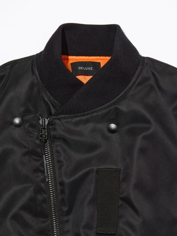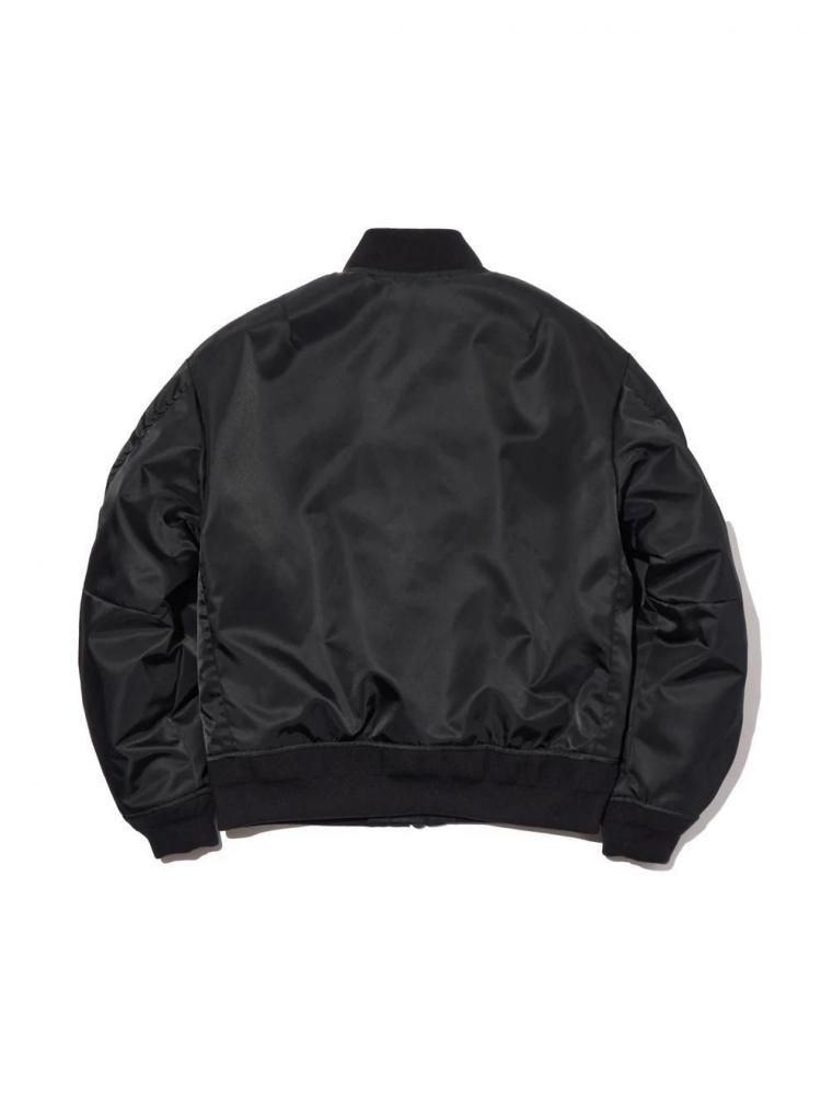 微光沢の高密度ナイロンを使用した変形ボンバージャケット。フロントは着脱性能を加味したスラント(斜め)ジップ、フロント襟はクロスネック仕様で仕上げたデザイン。フロント両脇にスラッシュポケット・左腕にファスナー付き変形シガレットポケット、ジャケット内側にもドットボタン付きスラッシュポケットを配置。左腰にメタルプレートを叩きつけ。身幅にゆとりのあるバルーン型シルエット。2色3サイズ展開。